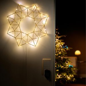 Die feine Drahtlichterkette ist fest mit der filigranen Konstruktion verbunden. Die warmweißen Lichtpunkte bleiben perfekt verteilt – nichts kann verrutschen. Der warme Goldton der Metallstäbe glänzt faszinierend festlich, aber dennoch dezent.