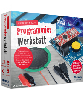 Programmieren und Elektronik machen Spaß – ganz besonders mit der Programmierwerkstatt. Denn dieses Paket enthält mit dem Arduino®-kompatiblen Mikroprozessor, dem Minerva-Shield, das mit zahlreichen LEDs und Sensoren bestückt ist, sowie einem Lautsprecher alles, um über 40 nützliche und lustige elektronische Gadgets aufzubauen.
