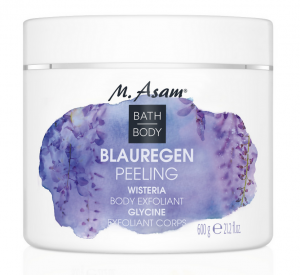 Das Peeling aus feinsten, in Traubenkernöl getränkten Zuckerkristallen duftet wunderbar fruchtig und floral nach blühendem Blauregen. Die natürlichen Zuckerkristalle sorgen für einen angenehmen Massageeffekt, abgestorbene Hautschüppchen werden sanft abgetragen, sodass das kostbare Traubenkernöl intensiv pflegen kann. Das Hautbild wirkt insgesamt praller, straffer und gleichmäßiger. Tipp: Wenn man die Zuckerkristalle vor der Anwendung etwas in Wasser einweichen lässt, kann man den Härtegrad des Peelings selbst bestimmen und es auch im Gesicht sowie an den Lippen anwenden.