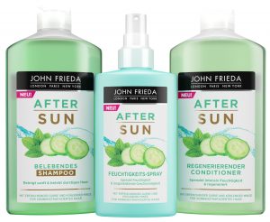 „So wie wir im Sommer unseren Körper mit ausreichend Flüssigkeit vor dem Dehydrieren bewahren, müssen wir auch unser Haar vorm Austrocknen schützen. Sonne, Salz- und Chlorwasser sind echte Strapazen für das Haar – und lassen es schnell strohig und brüchig werden. Eine richtige Haarpflege nach dem Sonnenbaden ist daher das A und O. Die Inhaltsstoffe der After Sun Pflegelinie von John Frieda sind perfekt auf die heiße Jahreszeit abgestimmt: Gurken bestehen zu 97 % aus Wasser und sind damit ideale Feuchtigkeitsspender. Minze kühlt, belebt und erfrischt.“ – Andreas Wild, John Frieda® Senior Stylist