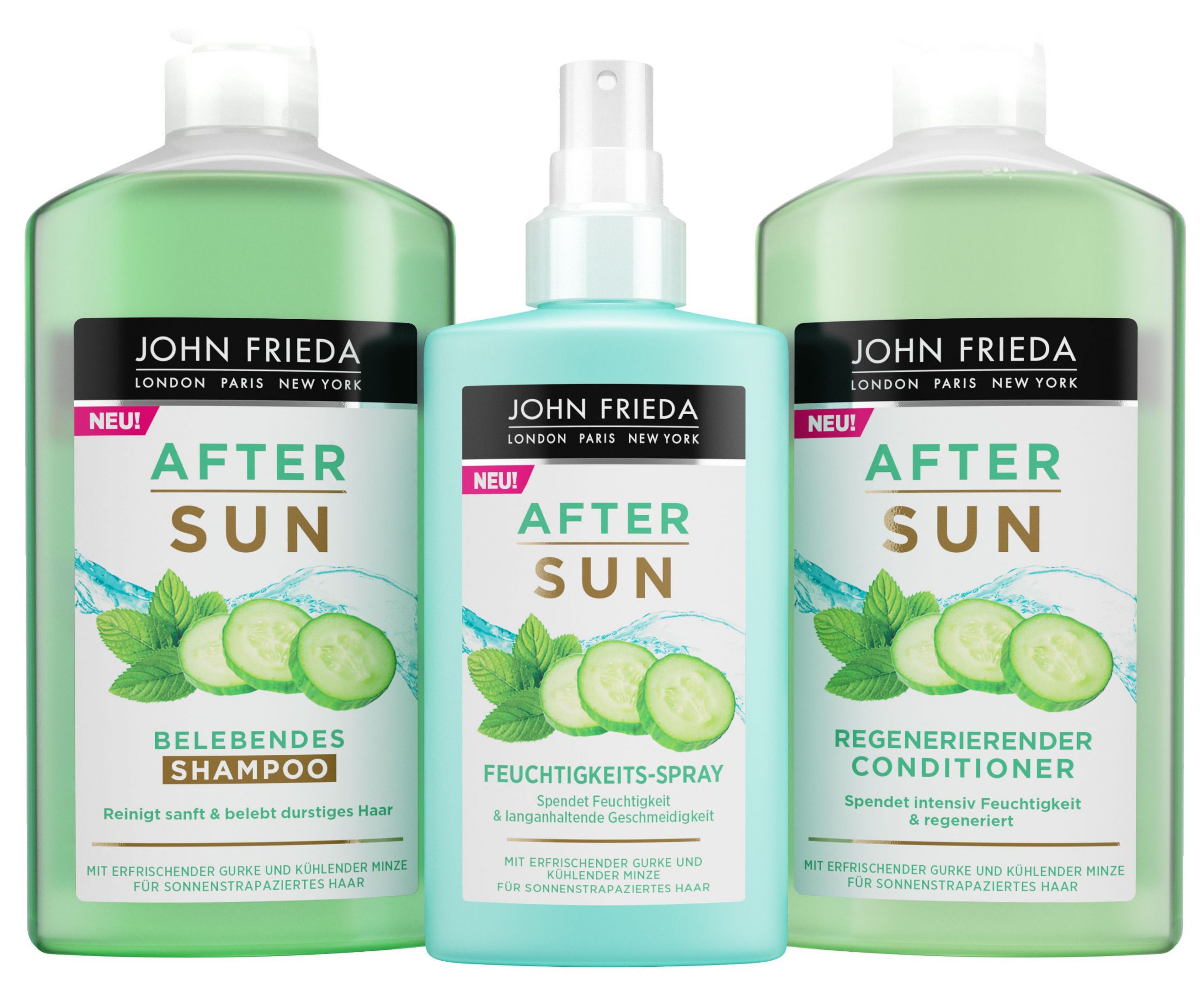 NEU! Die After Sun Pflegelinie von John Frieda® ist speziell auf die Bedürfnisse von sonnenstrapaziertem Haar abgestimmt. Shampoo, Conditioner und Feuchtigkeits-Spray kühlen und beruhigen das von der Sonne beanspruchte Haar. Die belebende Formel mit Gurke und Minze versorgt das Haar mit Feuchtigkeit und gibt ihm seine Geschmeidigkeit zurück. Für kräftiges und gesund aussehendes Haar voller Glanz.
