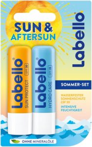 Das Must-have für Sonnenanbeter und der perfekte Begleiter für unterwegs: Der Labello Sun und Aftersun überzeugen durch ihre 24 Stunden langanhaltende Pflege* und die bewährte Labello-Formel mit natürlichen Inhaltsstoffen – ohne Mineralöle. Der Sun Protect Stick begeistert mit seiner Wasserfestigkeit und schützt die Lippen mit Lichtschutzfaktor 30 vor UVA- und UVB-Strahlen. Der Aftersun Hydro Care Stick pflegt die Lippen durch intensive Feuchtigkeit nach dem Sonnenbad und schützt sie ebenfalls mit Lichtschutzfaktor 15. Also ab in die Sonne – mit dem Labello Sommer-Set kann nichts mehr schiefgehen!