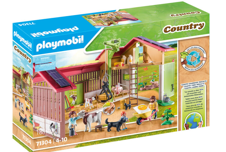 Wohnhaus mit liebevoll eingerichteten Wohn- und Schlafbereichen. Eine große zweiflügelige Tür im Erdgeschoss führt auf die Terrasse. Im Set enthalten sind viele Tiere zum Hegen und Pflegen. Eine Kuh ist beflockt als Fellimitation zum Streicheln. Ein kleiner Stall dient den ...