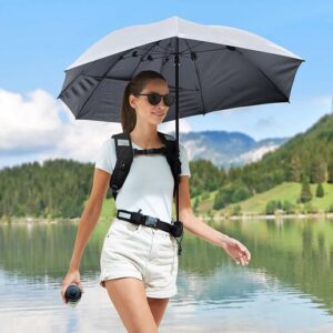 Von nun an sind Sie bei Sonne und Regen bestens geschützt und haben gleichzeitig beide Hände frei – für Walkingstöcke, Coffee-to-go, Smartphone, Kamera, … Der stufenlos bis auf 113 cm Länge ausziehbare Teleskopstock ist mit den beiden mitgelieferten Clips und Klett-Köchern ganz einfach an jedem handelsüblichen Rucksack mit Hüftgurt oder am separat erhältlichen Tragegurt zu befestigen. Die Extra-Bespannung der hinteren Segmente fährt beim Öffnen des Schirms automatisch aus und verlängert das 109 cm Ø große Dach nach hinten um 11 cm.