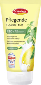 Die Schaebens Pflegende Fussbutter spendet intensive Feuchtigkeit, pflegt trockene Füße und zieht innerhalb von Sekunden ein. Glycerin und Sheabutter unterstützen die Wiederherstellung des natürlichen Feuchtigkeitsgehaltes und vermindern Trockenheits- und Spannungsgefühle. Der erfrischende Pfefferminzextrakt und Zitronenextrakt beleben die Sinne und laden zum Entspannen ein.