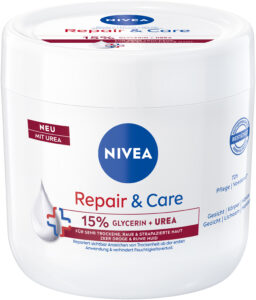 Nun erhält die bewährte Pflegeserie Verstärkung: Die neue NIVEA Repair & Care Creme mit UREA spendet sehr trockener, strapazierter Haut genau die Intensivpflege, die sie braucht. Die Formel mit einem Komplex aus 15 % Glycerin + Urea repariert bereits nach der ersten Anwendung sichtbar die Anzeichen trockener Haut, spendet bis zu 72 h Feuchtigkeit und sorgt spürbar für ein verbessertes Hautbild.