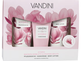 VANDINI HYDRO Geschenkset Trio Das VANDINI HYDRO Trio Set für normale bis trockene Haut besteht aus einer sanften HYDRO Pflegedusche, einer pflegenden HYDRO Body Lotion und einer HYDRO Handcreme. Die Formeln mit Magnolienblütenwasser und Mandelmilch ergänzt durch den jeweiligen HYDRO-Komplex verwöhnen die Haut mit wertvoller Feuchtigkeit. Dieses Set bietet ein regenerierendes Wellness-Erlebnis und verwöhnt die Sinne mit dem Duft von ...